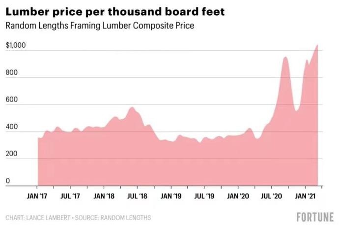据美国《财富》杂志网站20日报道,由疫情引发的木材短缺情况并未结束。根据全球木材产业调研机构Random Lengths的数据,自新冠肺炎疫情暴发以来,全球木材价格上升了188%。截至今年3月11日当周,每千板英尺(北美木材计量单位)的木材价格为1044美元(相当于每立方米442美元、约合人民币2876元),创历史最高水平。据美国全国住房建筑商协会测算,目前的木材价格将一栋典型的独栋新房的售价推高至少2.4万美元。